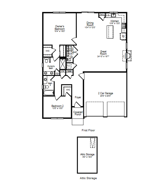 Ranch Style Home with Great Room, Island Kitchen, Pantry Cabinet, and Attic Storage.